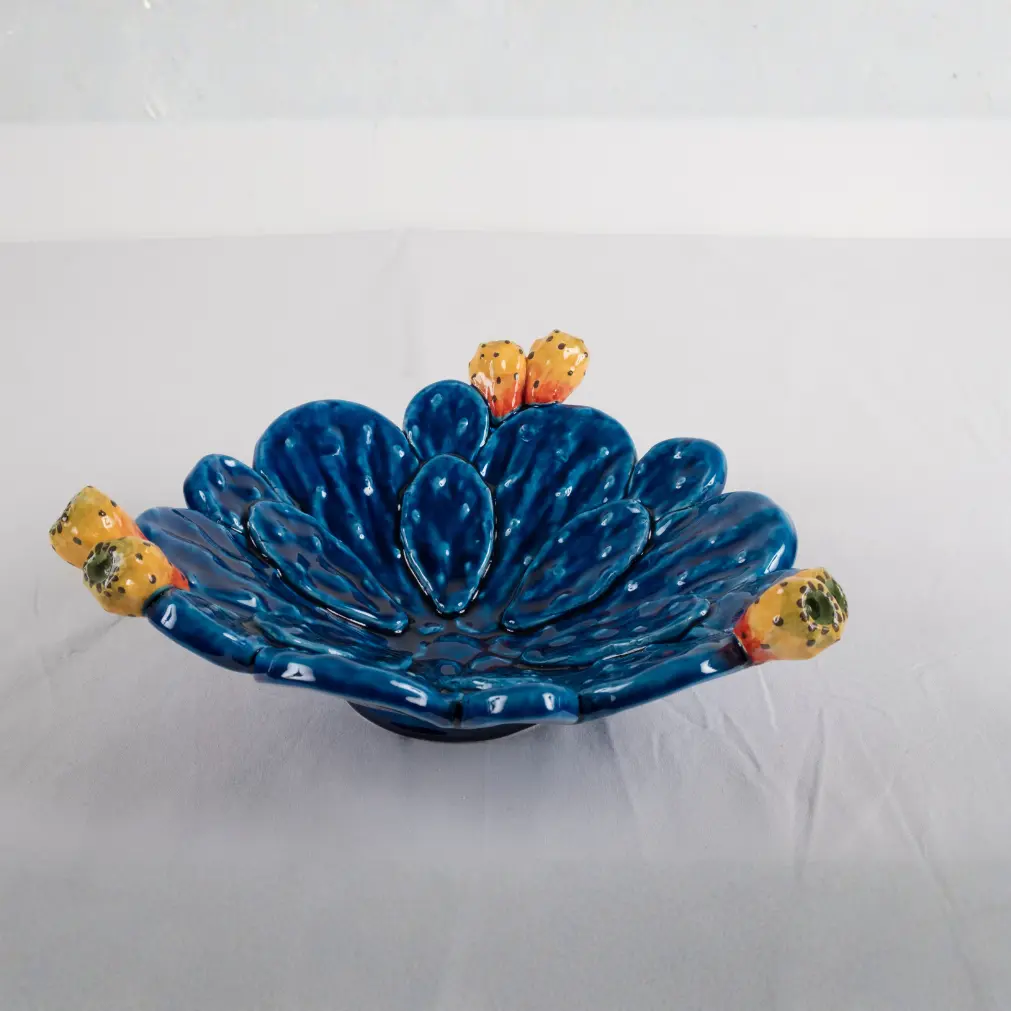 Il bordo è impreziosito da fichi d’India applicati in rilievo, dipinti nei toni del giallo e arancio con dettagli puntinati, creando un contrasto cromatico vivace e armonioso.