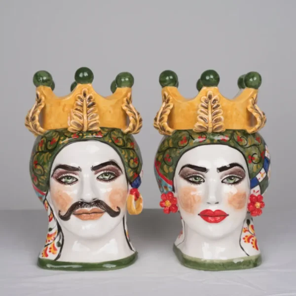 COPPIA TESTE IN CERAMICA DECORO CARRETTO SICILIANO H CM 21 VERDE