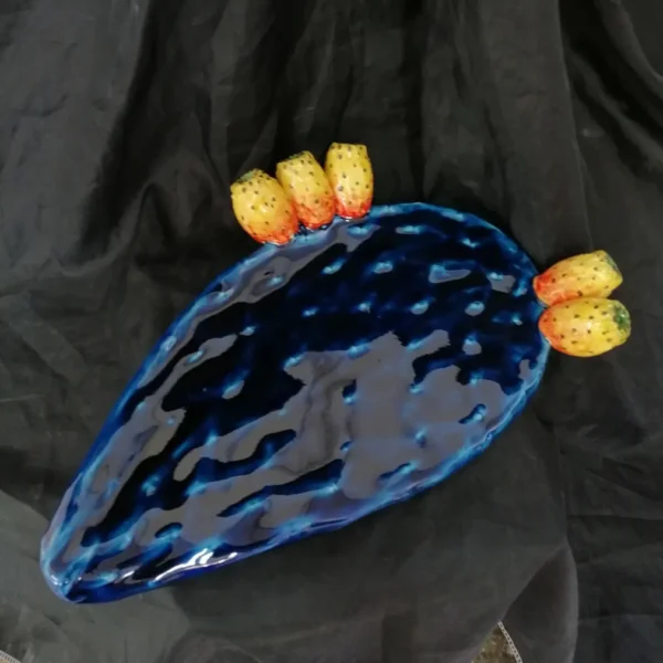 La decorazione è arricchita da cinque fichi d’India applicati in rilievo, dipinti nei toni del giallo, arancio e verde, che creano un contrasto cromatico vivace e scenografico.